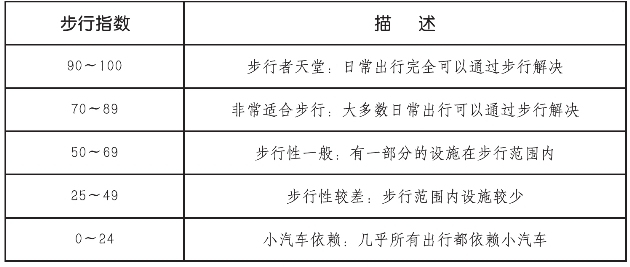 步行指数是步行性的量化测度,根据得分高低,可以分为五级(见表4)得分越高,步行性越好,日常出行基本可以通过步行满足,随着得分的降低,步行能到达的目的地减少,对小汽车的依赖增强。步行指数评价表是步行性评价的主要手段,同时也作为步行社区建设目标的重要依据。自从2007年“步行指数”诞生以来,美国每年一度对其各大城市进行步行指数的测算并进行排名,步行指数的优化正在成为城市新的魅力增长点。同时,社会各界研究人士也对“步行指数”表现出了浓厚的兴趣,相关研究主要集中在经济学和社会学领域。经济学相关研究又以房地产价值评估、投资分析等为主;社会学领域的研究相对广泛,涉及步行指数与生活质量的关系,对居民身体健康的影响,对环境保护和资源节约的促进作用,社会行为学相关研究(如不同居民及不同出行目的对步行指数的反馈差异等),与城市创意性、创意阶层等的相关关系等。