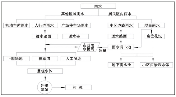 2.非传统水源利用。充分利用本地和区域资源条件,大力开发主要包括再生水、雨水的非传统水源。通过水资源的优化配置,非传统水源利用量占水资源总利用量的比例达到50%。本着提高水资源利用效率和减少城市污水对自然水生态不良影响的原则,园区的污水要达到80%进行再生回用。污水再生回用按处理方式主要分为两部分:一部分污水厂出水直接进入区内生态水体作为补水,另一部分污水厂出水经再生水厂处理达到相应水质标准后回用于区内的道路浇洒用水、绿化用水和公共冲厕用水。雨水利用实现非汛期雨水不进行外排,全部在区内充分利用,汛期雨水量超过区内消纳能力时通过排涝设施进行有效外排。雨水优先考虑通过路面、绿地雨水的下渗以及收集屋面雨水进行分散收集并就近利用,多余径流通过市政雨水管网作为区内水体生态补水。其雨水利用模式如下图。