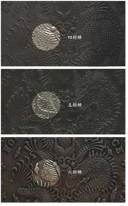 存世量和版别较七分二厘大龙还要少。按龙面龙须左边龙身部分的鳞排数分版,有四排鳞,五排麟,六排鳞等,再往下可以根据龙身周围云朵的相对位置细分。