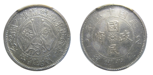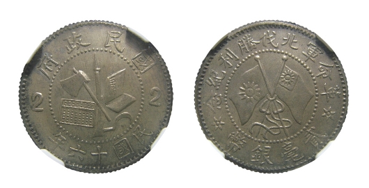 1926年10月,国民革命军东路总指挥何应钦受命调遣各部迅速进取闽浙。11月8日,东路军占领漳州,23日直取泉州,12月3日克复福州,从而结束了北洋军阀对福建长达13年之久的统治。在这历史大转折的当口,漳州、福州两地几乎同时铸造了“东路军总指挥入闽”和“北伐胜利”两枚纪念币。“北伐胜利”一枚,背有代表工农兵学商的斧头、镰刀、步枪、书本、算盘图案,“东路军总指挥入闽”一枚,以青天白日满地红国旗和青天白日国民党旗为图案,均是当时形势的真实写照。在海军铸币一节里,我们还会看到,不甘落后的马尾海军银圆局,也铸造了铁锚总理侧像及双旗总理侧像两枚。这四枚银毫,共同谱写了福建银毫的辉煌篇章。