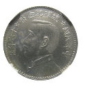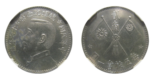 民国十六年(1927年)海军马尾银圆局铸。正面主图案采用铁锚纪念币之孙中山先生侧面头像,上缘中间署“总理纪念币”,两端饰以五角星,星侧分署“中华民国”“十六年造”;背面以交叉民国国旗和国民党党旗为主图案。该银辅币属试铸,只有少量样币存世。