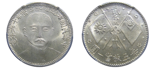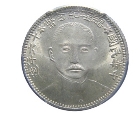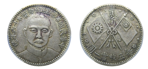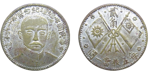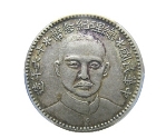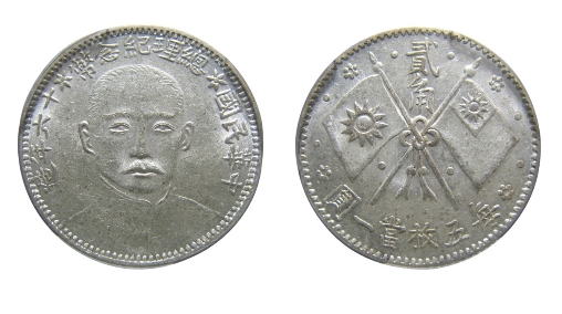 民国十六年至十九年(1927-1930年)海军马尾银圆局铸。币面主图案为孙中山先生正面头像,上缘中间署“总理纪念币”,两端饰以梅花星,星侧分署“中华民国”“十六年造”;背面仍以交叉民国国旗和国民党党旗为主图案,但与侧像贰角图案略有不同,间饰对称小圆星及梅花星,上缘直书“贰角”以示币值,下缘署“每五枚当一元”。