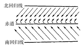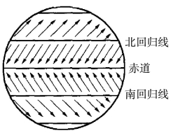说明了地球偏向力以后,我们再来讲地球上的风带。上面已经说过,地球上赤道两边的风统统向赤道附近区域吹来。照理在赤道以北在北热带内应该是北风,在赤道以南在南热带内应该是南风。但为了地球自转发生偏向力的关系,北热带内风向是东北,称之为东北信风或贸易风,南热带内风向是东南,称之为东南信风或贸易风(如图三)。而因为冬夏春秋四季的变动,地球各处上的太阳在天空位置的高低既有不同,风带亦随之而有移动。北半球夏季的太阳走向北,风带亦随之而移向北。而南半球的东南信风,一经跨过赤道,便慢慢地有转向右边的趋势,不久便会变成西南信风,如图四所示。这西南信风和北半球原有的东北信风相遇到了,正是针锋相对,便会发生旋流。若是四周的环境适合,就会在太平洋中发生台风了。台风在大西洋中称“Hurricane”,在印度洋中称“Cyclone”。