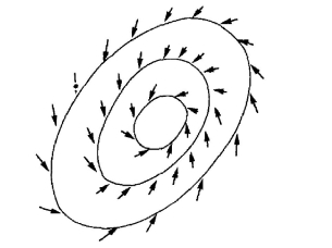 台风既是涡动,它的中心气压最低,风就环绕这低气压的中心而旋转,如图五。越到中心,风力越大。空气环绕着中心愈强,发生的离心力亦愈大。气压有时可以低到700毫米以下(海平面气压平均为760毫米)。世界上所有海平面上的最低气压、最大风力和最密暴雨,统是在台风中造成功的。台风四周风向的分布,使空气旋转不已,其中心的低气压便不容易消灭,而且有时使之程度加深,范围扩大。若是我们在台风附近以背向风而立,则台风中心便在我们的左手边。若从我们立足点到台风中心划一直线,这线与风向将成120度到135度的角度,如图五。
