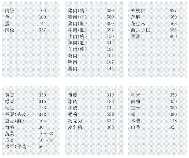 (4)常见食物所含热能(千卡/100克食物)(据杨月欣《食物成分表》)