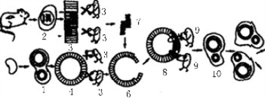 1.大肠杆菌2.鼠细胞3.限制性内切酶4.质粒5.鼠DNA 6.切断的质粒7.鼠基因8.带鼠基因的质粒9.连结酶10.带新质粒的大肠杆菌