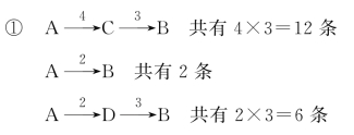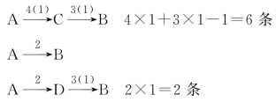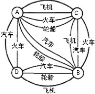 如图,从A镇到B镇可以由A到C再到B,也可以由A到D再到B,也可由A直接到B。从A到C可有飞机、汽车、轮船、火车四种方式,从C到B可有火车、汽车、飞机三种方式,从A到B只有汽车与轮船两种方式,从A到D可有汽车、火车两种方式,而从D到B可有汽车、轮船、飞机三种方式。
