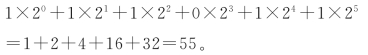 我们来看看十进位制和二进位制之间的换算。例如55,是32、16、4、2、1的和,用二进位制表示就是110111。而110111换算成十进制等于