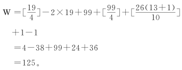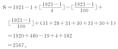 这里x是公元的年数,C是从元旦数起到这一天为止(包括这一天)的天数,方括号表示一个数的整数部分。求出S后,再用7除,其余数便表示这一天是星期几:余数为0,则为星期日;余数为1,则为星期一;依此类推。