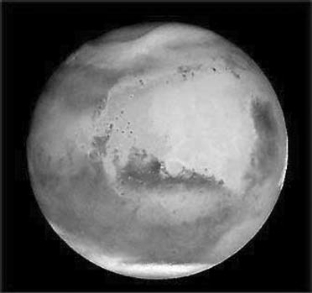 火星是一颗火红色的行星,点缀在天空夜幕上,是星空中最为吸引人的繁星之一。仔细观察,可以看到它缓慢地穿行在众星之间,如火的荧光时有强弱变化,并且穿行的方向、亮度的变化好像没有规则,所以古时候欧洲人把它当作“战神星”,认为它象征着战争和灾难;中国人称它为“荧惑星”,认为是不吉利的星。火星离地球很近,在地球的外侧绕太阳运行,并且与地球有极为相似的许多特征:在火星上有白天黑夜的交替,有春夏秋冬的四季变化;在火星上看太阳也是从东方升起,从西方落下;火星的自转周期也与地球相近,为24小时37分,仅慢半个小时;并且与地球有月亮环绕一样,火星也有两颗卫星只是比地球小,火星的直径只有地球直径的15%,一年为地球的687天,并且温差比地球上大得多,特别是昼夜温差,白天为最高28℃,夜间则下降为零下132℃。结果,没有生物在火星上生长,更没有人类,人们长期想像中的“火星人”、“火星鼠”仅仅是一种想像而已。自1962年以来,美国等国的天文学家向火星发射了15个探测器,并派飞船登上了火星,发现火星的表面是干燥、荒凉的旷野,有许多沙丘、岩石和火山口,有比地球上的峡谷大得多的峡谷,有比喜马拉雅山更高的山峰,虽然有大气层,却95%以上为二氧化碳,并且极为稀薄,氧气极为罕见。