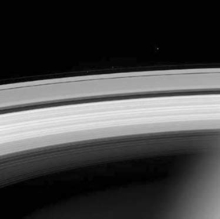 原来,人们根据地面观测和空间探测,把土星环划分为7层。距土星最近的是D环,亮度最暗,其次是C环,透明度最高,B环最亮,最后是A环。在A环和B环之间有段黑缝,这就是著名的卡西尼环缝,缝的宽度大约5000千米。在A环之外有E、F、G三个环,最外层的是E环,十分稀薄和宽广。旅行者1号和2号探测器把土星环的近距离照片送回地球后,科学家们非常吃惊:原来每一个小环又可细分成上千条大大小小的小环,即使被认为空无一物的卡西尼缝也存在几条小环。在高分辨率的照片中可以见到F环有5条小环相互缠绕在一起。土星环的整体形状就类似一个巨大的密纹唱片,从土星的云顶一直延伸到32万千米远的地方。