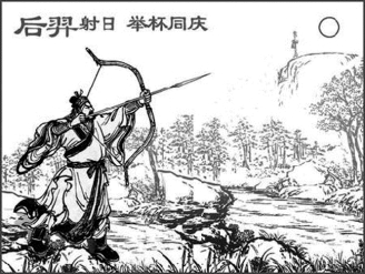 相传,远古的时候,天上出现了十个太阳,烤得大地冒烟,海水枯竭,老百姓眼看就无法再生活下去。这件事惊动了一个叫后羿的英雄,他登上昆仑山顶,运足神力,拉开神弓,一口气下了九个多余的太阳,解救百姓于水火这中。不久,后羿娶了个美丽的妻子叫嫦娥。