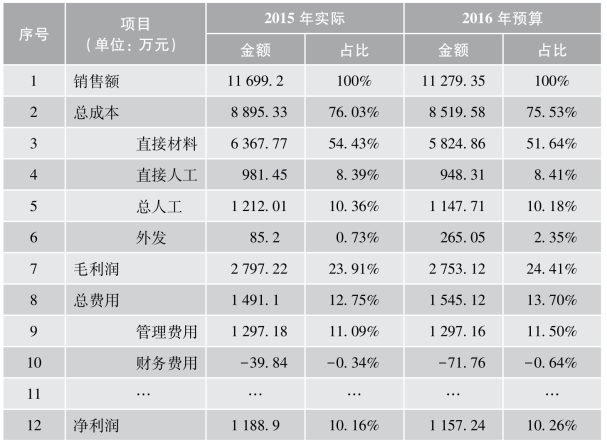 在年度和季度战略绩效工作坊中,我们都会对公司、业务单元进行类似的成本费用分析表(表8-2),找到成本的改善点,比如什么成本需要增加,什么成本需要减少,为什么?与普通财务报表不同,我们不只是关注成本的绝对值,而是关注成本的结构和成本的相对值,就是说我们需要关注成本的变化对销售额所产生的影响。比如原材料上涨对利润的影响是什么?或者说外发对利润的影响是什么?什么该自己做,什么应该外发?等等。通过年度的成本对比可以清楚地看到成本的变化趋势,同时通过预算和实际的对比可以看到需要管理的空间。