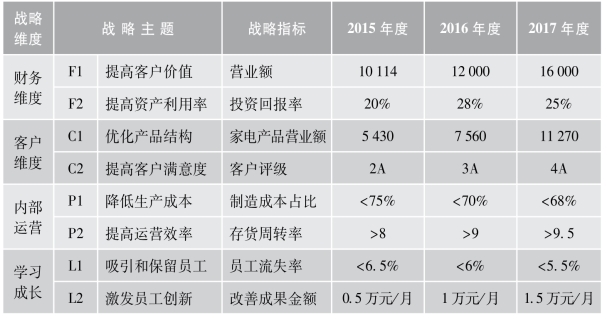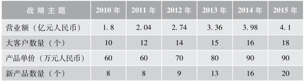 与目标的差距是1.8亿人民币,那这个差距来自哪里呢?通过研讨,大家确定主要来自三个路径:第一,启动大客户战略,调整客户结构,增加并保留高价值的大客户。比如高价值的大客户数量从10家增加18家,营业额增加0.9亿人民币;第二,增加客户价值、提高产品和服务的价格,单套产品从60万人民币提高到90万,营业额因此增加0.9亿人民币;第三,增加新产品数量,交叉销售,增加大客户购买产品的品种数量,这样增加0.5亿人民币。因此,如果每个战略措施都能实现设定的目标,那么M公司达到整体目标。当然,这三个战略措施将在不同的阶段带来效益,其中调整客户结构在1—2年内即可达成。增加客户价值,提高产品价格则需要较长的时间,2—3年后才会实现。而产品创新,增加新产品的数量则需要更长的时间。这样,M公司根据实际情况估计,按照各个战略主题实现收益所需要的时间,分别设定一个战略绩效目标。到了2015年,这三项战略措施都达到了目标值,公司的战略目标也就实现了。