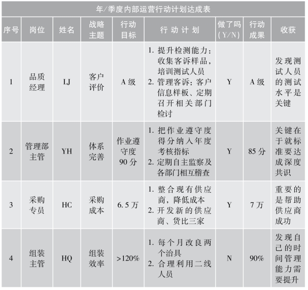 试想,如果每个年度、季度和月度都能针对战略绩效中的亮点和难点展开持续的对话、研究、尝试、参观、学习等,那每个人的成长一定会突飞猛进。亮点虽然是过去的,但可以用来分享、学习和进一步发扬光大;而难点是面对未来的,你的难点可能是别人的亮点,因此,开放的学习和对话是非常重要的。在行动跟进中,刚开始我们也许会发现有很多领域需要加以改进,这个时候只要行动起来就可以了,确保在行动中让自己比过去做得更好。随着经验的积累,问题越来越少,我们的注意力开始转向如何保持成功率,最终,每个部门都形成了一系列的“成功指引”,即将自己的最佳实践记录下来,写成书面的报告,并将它们输入公司的IT系统以供回顾。