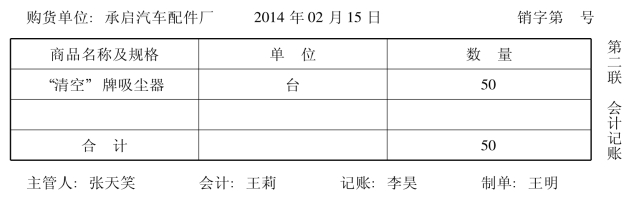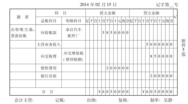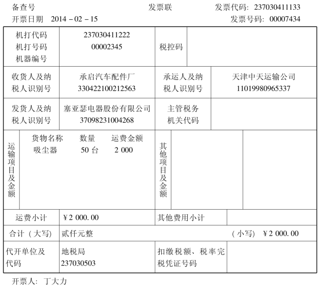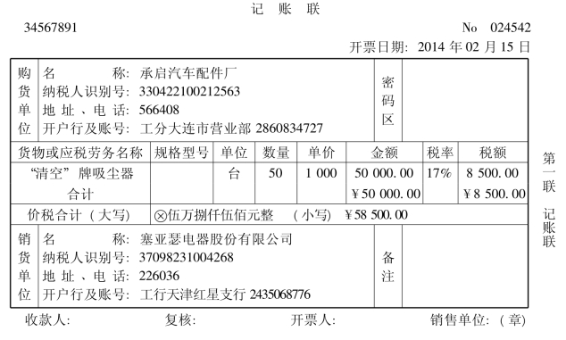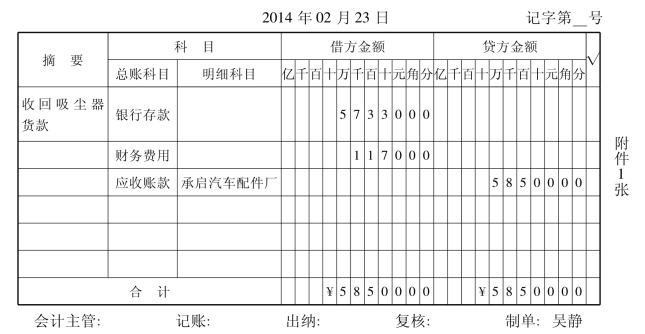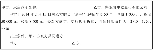 2014年2月15日,塞亚瑟电器股份有限公司销售给承启汽车配件厂“清空”牌吸尘器50台,单价1000元,货款50000元,税款8 500元,运杂费2000元(由销货方承担)以转账支票支付。根据合同规定货款实行现金折扣,付款条件为:2/10,1/20,n/30。2014年2月23日,收到欠款。