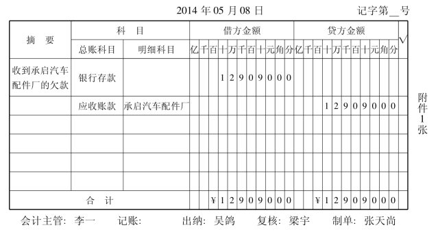 (3)经相关会计人员复核后在复核栏签字或盖章,并登记应收账款明细账(应收账款承启汽车配件厂借方期初余额为389000元)。