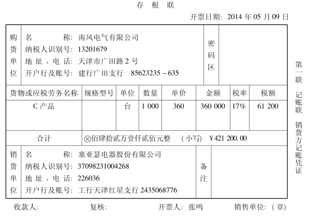 2014年5月9日塞亚瑟电器股份有限公司向南风电气有限公司销售产品1000台,不含税单价为360元,本企业销售政策规定,凡客户一次性购买500台以上的给予商业折扣10%。货已发出,已办妥委托收款手续。