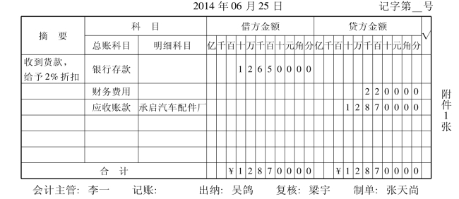 塞亚瑟电器股份有限公司于2014年6月5日向承启汽车配件厂销售产品,已办理托收手续。为了早日收回货款,企业给予该厂2/20、n/30的现金折扣条件,并于6月25日收到承启汽车配件厂支付的货款,则给予2%的折扣。