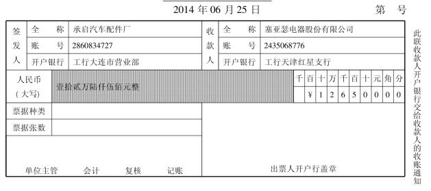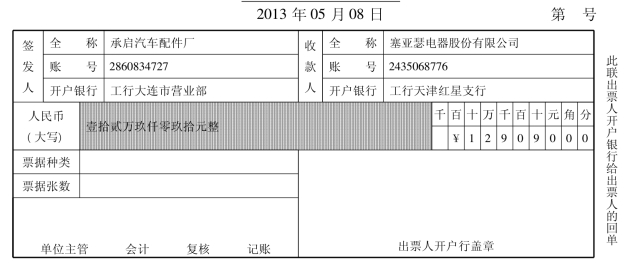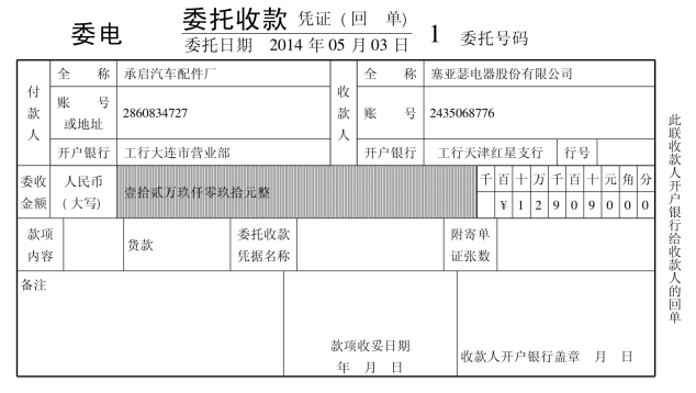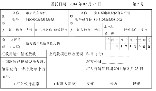 (5)2月23日,塞亚瑟电器股份有限公司接银行通知,承启汽车配件厂货款收到。