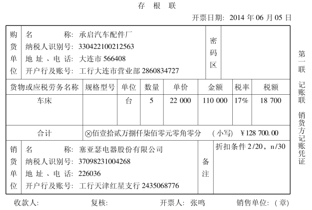 (1)塞亚瑟电器股份有限公司往来会计收到出纳转来支票存根、销售部门开出的销售发票记账联、运输发票、购销折让合同、商品出库单记账联,进行审核。