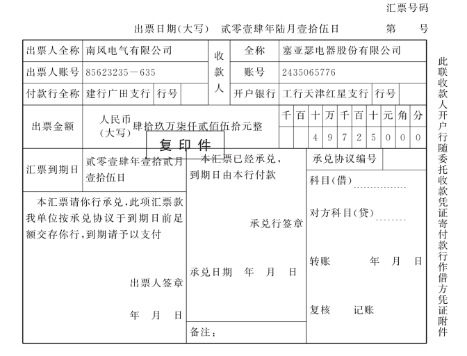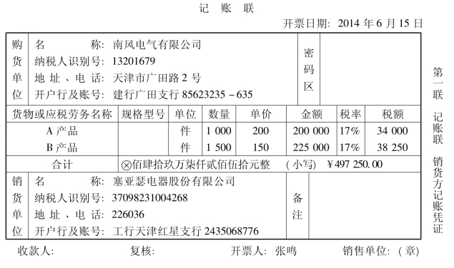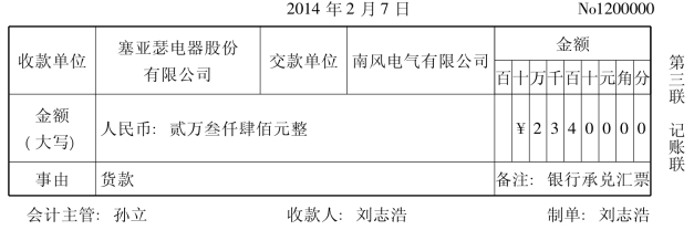 (1)塞亚瑟电器股份有限公司往来会计收到南风电气有限公司银行承兑汇票第二联及销售部门开出的销售发票记账联、商品出库单记账联、收款收据记账联,进行审核。