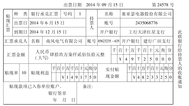 2014年6月15日塞亚瑟电器股份有限公司向南风电气有限公司销售一批产品,收到6个月银行承兑汇票一张。由于塞亚瑟电器股份有限公司急需用款,于2014年9月15日将上述票据到银行办理贴现。