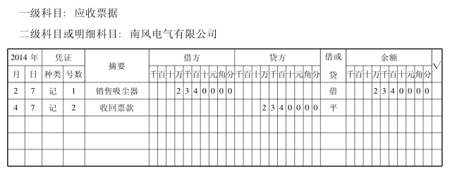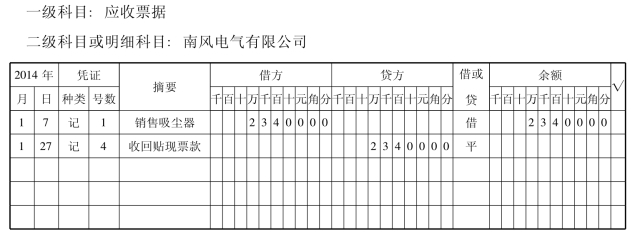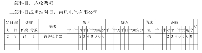 (7)塞亚瑟电器股份有限公司往来会计将记账凭证提交财务负责人稽核、签字盖章,稽核后根据记账凭证登记“应收票据明细账”。