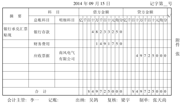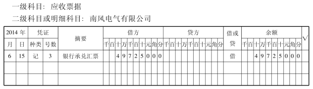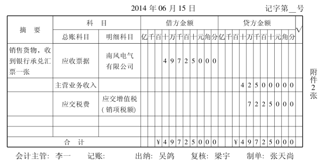 (3)往来会计将记账凭证提交财务负责人稽核,并在“复核”处签名盖章 。稽核后根据记账凭证登记“应收票据明细账”。
