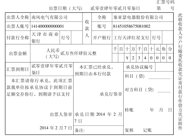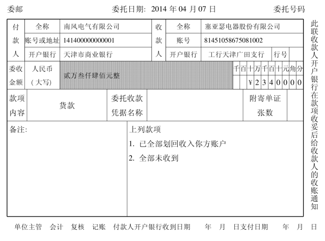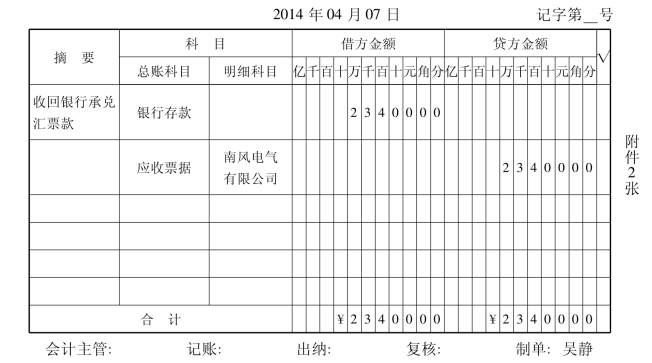 (5)应收票据到期收回。在提示付款期内,填制委托收款凭证交由开户银行办理收款业务。于2014年4月7日收回票款,收到银行转来的委托收款凭证第一联和第四联。