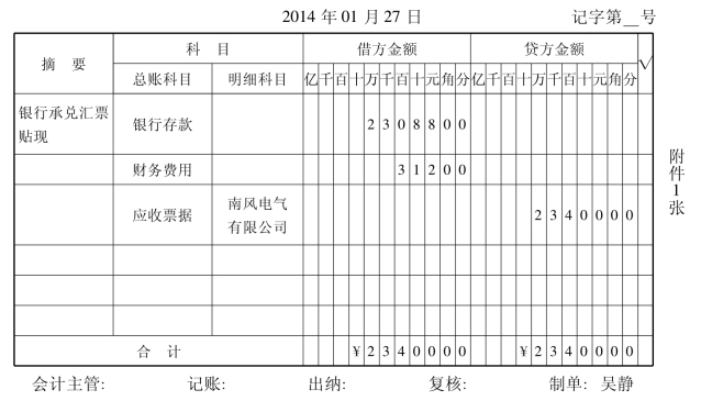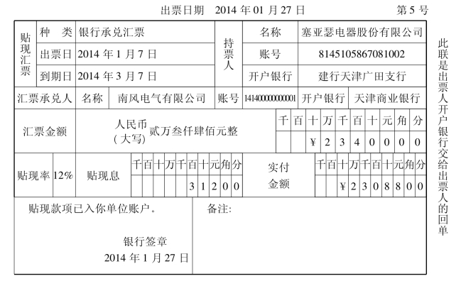 (1)2014年1月27日,塞亚瑟电器股份有限公司出纳办理银行承兑汇票贴现手续,经银行审查同意,收到银行收账通知。