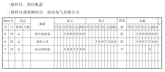 (3)塞亚瑟电器股份有限公司往来会计将记账凭证提交财务负责人稽核后根据记账凭证登记“预付账款明细账”(见表4-59)。