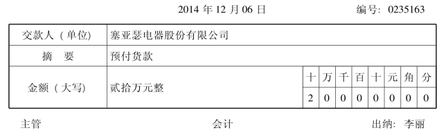 (1)塞亚瑟电器股份有限公司出纳办理预付货款时取得汇款凭证。