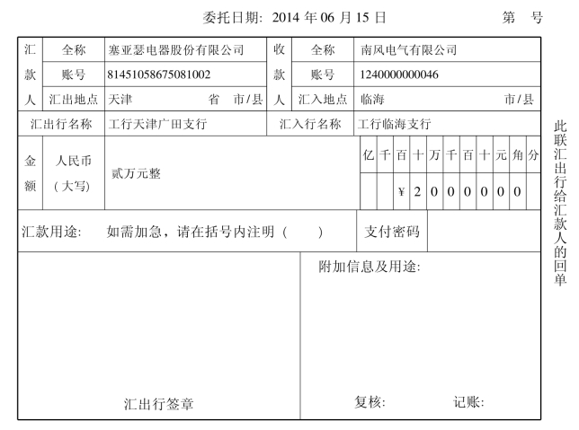 (2)塞亚瑟电器股份有限公司往来会计根据汇款凭证填制记账凭证。