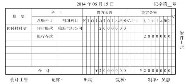 2014年6月15日,塞亚瑟电器股份有限公司从南风电气有限公司购进电动机150台,单价450元,增值税率17%。根据供销合同规定采用预付货款方式结算货款,于发货前预付货款2万元,其余货款于收货后20天结清。