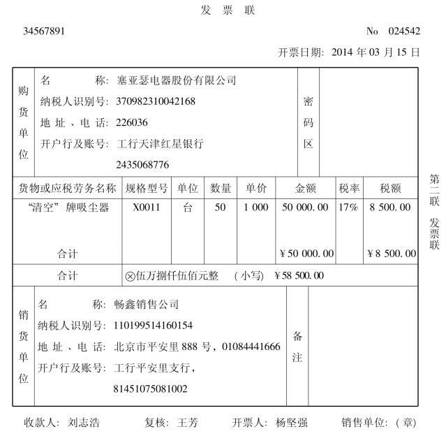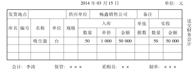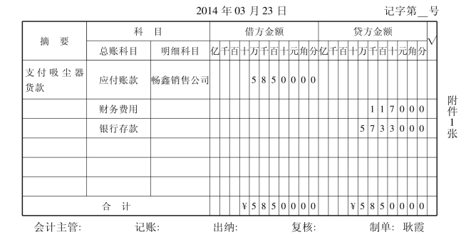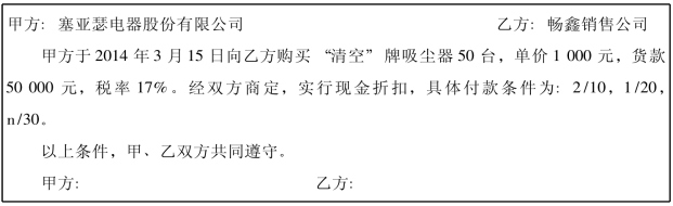 2014年3月15日,塞亚瑟电器股份有限公司从畅鑫销售公司购进“清空牌”吸尘器50台,单价1000元,货款50000元,税款8 500元。根据合同规定货款实行现金折扣,付款条件为:2/10,1/20,n/30。2014年3月23日支付货款。