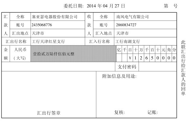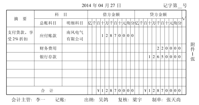 2014年4月7日塞亚瑟电器股份有限公司向南风电气有限公司购入产品用零件。对方给予2/20、n/30的现金折扣条件。货已收到,款未付。塞亚瑟电器股份有限公司于4月27日付款,享受2%的折扣。
