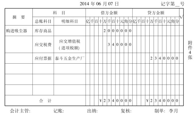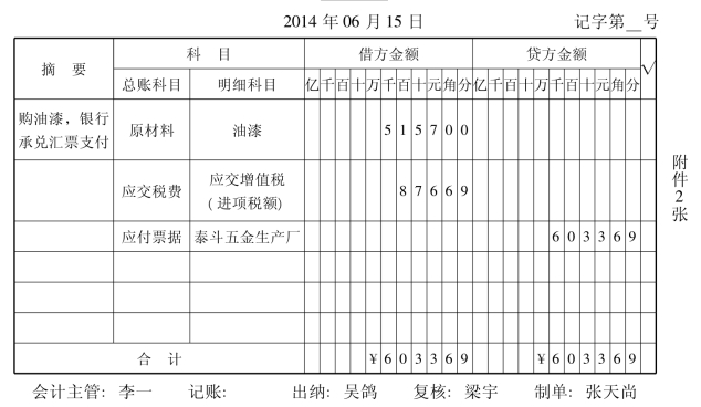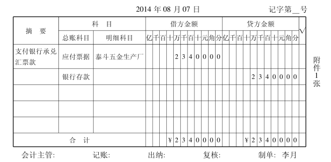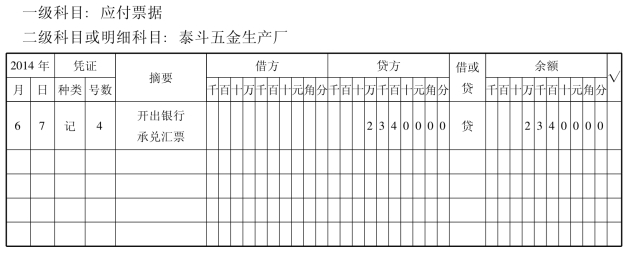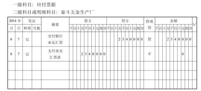 (3)往来会计将记账凭证提交财务负责人稽核,稽核后根据记账凭证登记“应付票据明细账”。