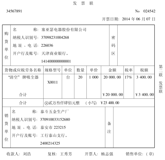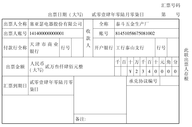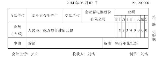 (2)塞亚瑟电器股份有限公司往来会计根据收到的银行承兑汇票第三联、商品入库单记账联、泰斗五金生产厂销售发票发票联、收款收据收据联等填制记账凭证。