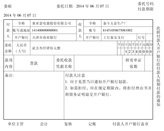 (6)塞亚瑟电器股份有限公司往来会计将收到的委托收款凭证第五联(付款通知),审核后填制记账凭证。