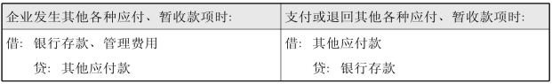 企业发生其他各种应付、暂收款项时,借记“银行存款”、“管理费用”等科目,贷记“其他应付款”科目;支付或退回其他各种应付、暂收款项时,借记“其他应付款”科目,贷记“银行存款”等科目。具体如表9-2所示。