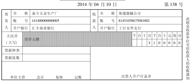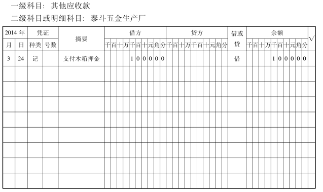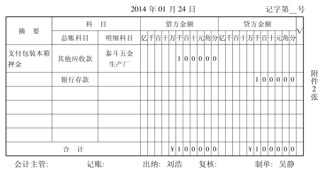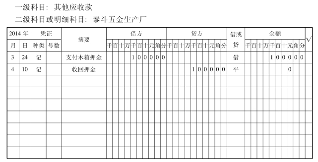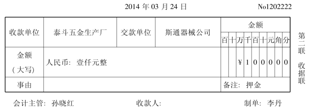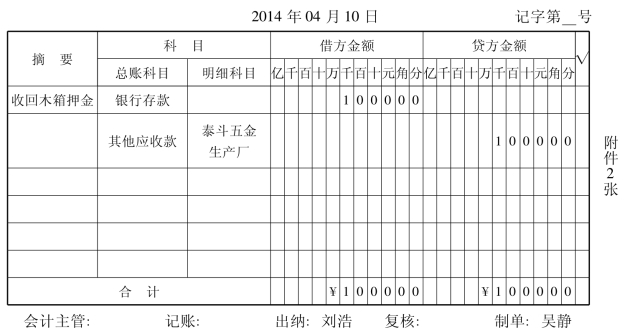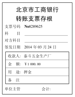 2014年3月24日,斯通器械公司向泰斗五金生产厂采购材料一批,借用包装木箱20个,支付押金1000元,以转账支票支付。2014年4月10日,归还包装木箱,收回押金。