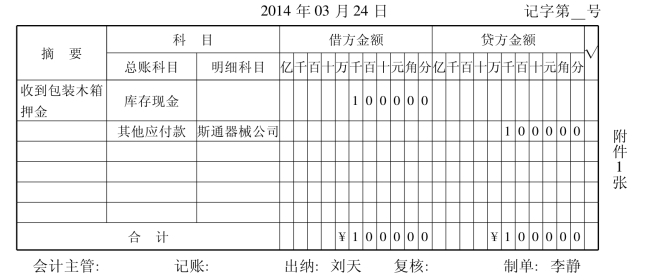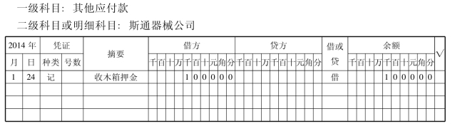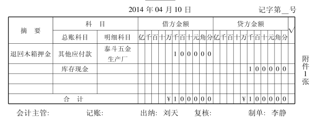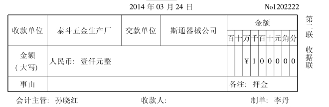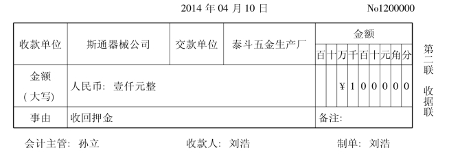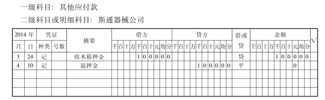2014年3月24日,泰斗五金生产厂销售给斯通器械公司材料一批,租用包装木箱20个,收取押金1000元。2014年4月10日,还回包装木箱,退回押金。