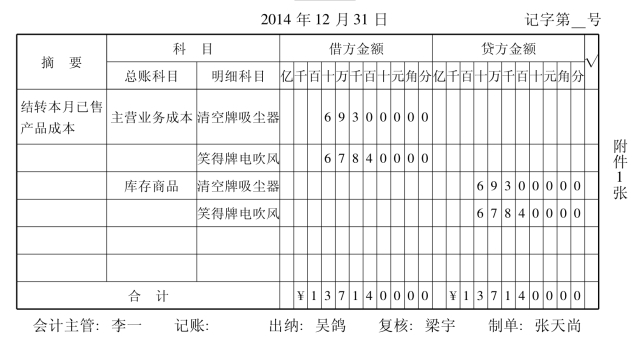(3)编制记账凭证。12月31日由财务成果核算人员根据“产品销售汇总表”,编制结转产品销售成本的记账凭证(见表15-2),并报送财务部负责人稽核。