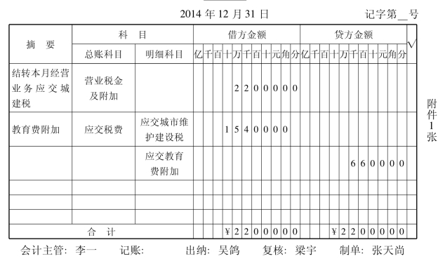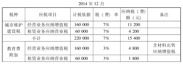 2014年12月末根据主营业务和其他业务应纳增值税、营业税(本公司不需交纳消费税)计算结转应交城市雏护建设税、教育费附加(见表15-4)。