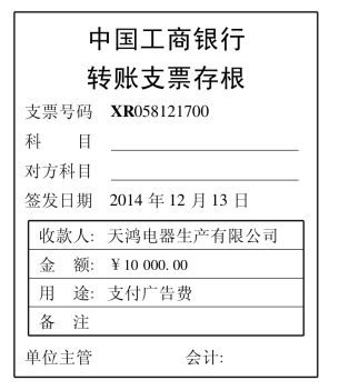 开出转账支票支付大同市海德广告公司广告费10000元。原始凭证如表16-11及表16-12所示。