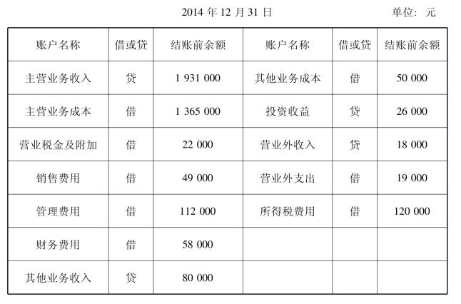 天鸿电器生产有限公司利润形成的结转采用账结法,2014年1~11月实现净利润为33万元(“本年利润”账户贷方余额)。12月份结转前各损益账户余额见表18-7。