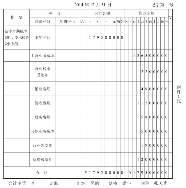 (2)财务成果核算人员分别编制结转收入、收益和成本、费用、支出的记账凭证,如表18-8和表18-9所示。并送财务部负责人稽核。