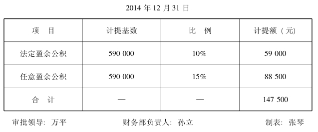 天鸿电器生产有限公司2014年度实现净利润59万元,无弥补以前年度亏损事项,年末按规定比例10%计提法定盈余公积,同时根据公司决议本年度按15%计提任意盈余公积。