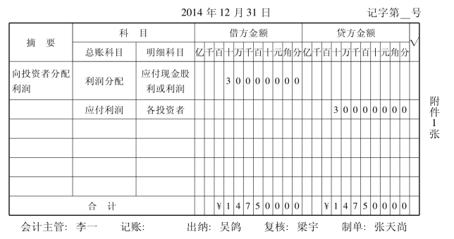 (2)根据审批后的利润分配名册,编制向投资者分配利润的记账凭证(见表18-15),并报送财务部负责人稽核。